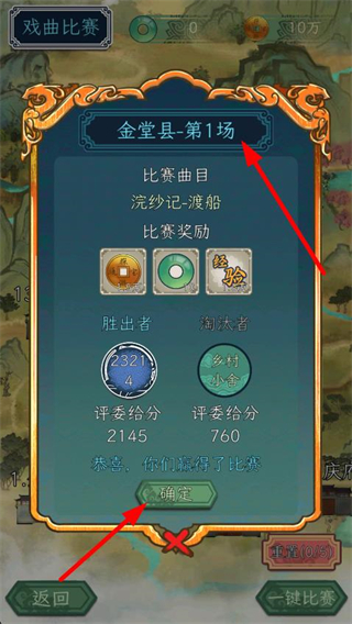 2、比賽結束后會顯示場次信息,包括比賽曲目和獎勵,同時呈現評委給分,確認自己勝出后,點擊確定即可領取對應獎勵。