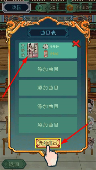 3、在戲園的曲目表界面,選擇已有的曲目標識,添加到表演列表里,選好后點擊開始演出,即可開啟這場戲曲表演。