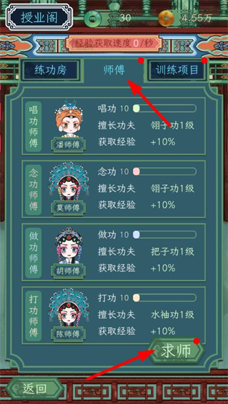 4、進入授業閣界面,選擇不同的訓練項目對應的師傅,點擊求師,即可讓角色跟隨師傅學習,提升對應能力并獲取經驗加成。