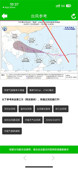 2、在臺風參考頁面可查看今年第25號臺風海鳴的未來可能影響區域概率圖,還能選擇深圳臺風網、溫州臺風網等查看詳細信息。
