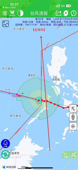 1、進入臺風速報app主頁面可查看臺風海鳴的風級、風速等實時信息,地圖上顯示臺風路徑和影響區域。