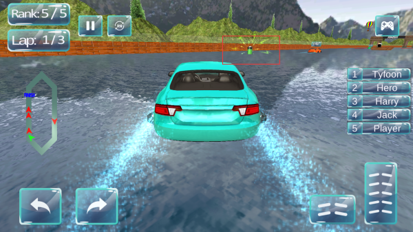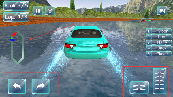 2、進入比賽后使用屏幕左下角的左右方向按鈕來控制賽車的轉向,右側的加速按鈕控制賽車的速度,讓賽車在水上賽道上順利行駛。