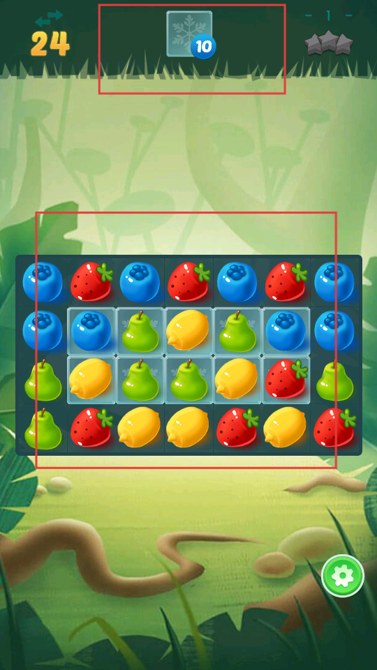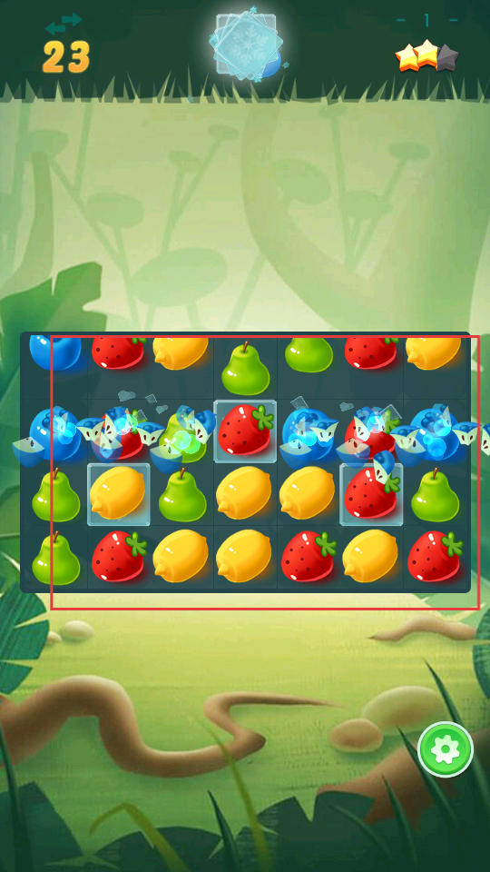 2、進入關卡后,界面有多種水果,上方顯示剩余步數和目標,通過移動水果,讓相同的水果連成線消除,消除時會有特效,同時要注意完成目標。