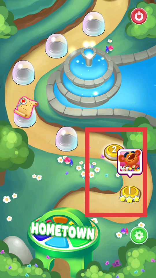 1、進入游戲地圖界面,能看到標有數字的關卡標識,選擇對應關卡,開啟水果消除之旅,地圖里還有噴泉等裝飾,增添游戲氛圍。