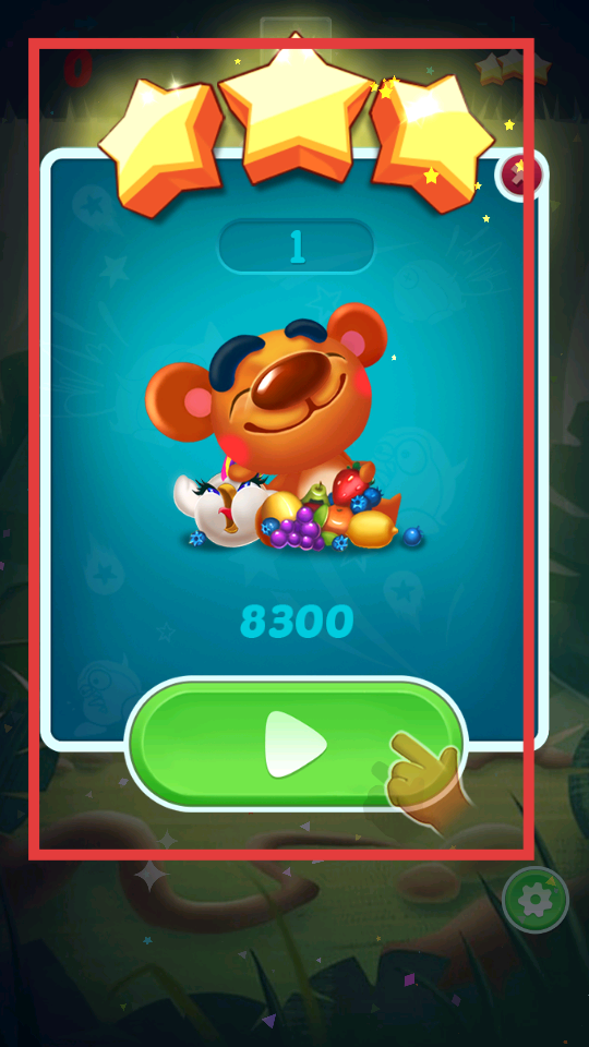 4、成功完成關卡后,會顯示結算界面,能看到獲得的星星數量和分數,點擊綠色帶三角形的按鈕,就可以進入下一關,繼續挑戰更多水果消除關卡。