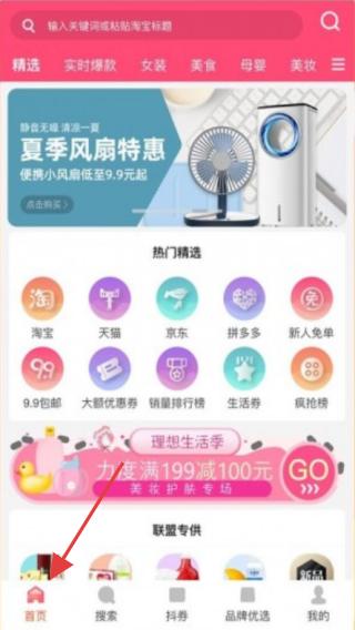 3、首頁界面頂部有搜索欄方便查找商品和專題,底部首頁、搜索等導航欄,首頁是默認主界面,匯聚各類優惠資源,助力用戶領券購物、發現爆款,滿足實惠購物需求。