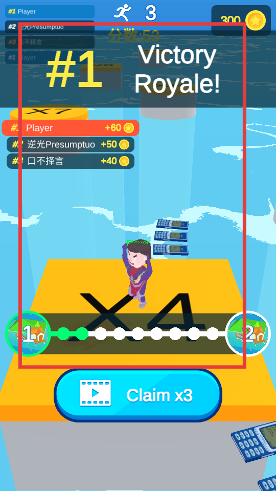 4、率先到達終點后,游戲顯示勝利,會獲得金幣獎勵和排名,還能選擇觀看視頻領取多倍獎勵,之后可繼續挑戰新關卡。