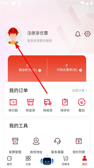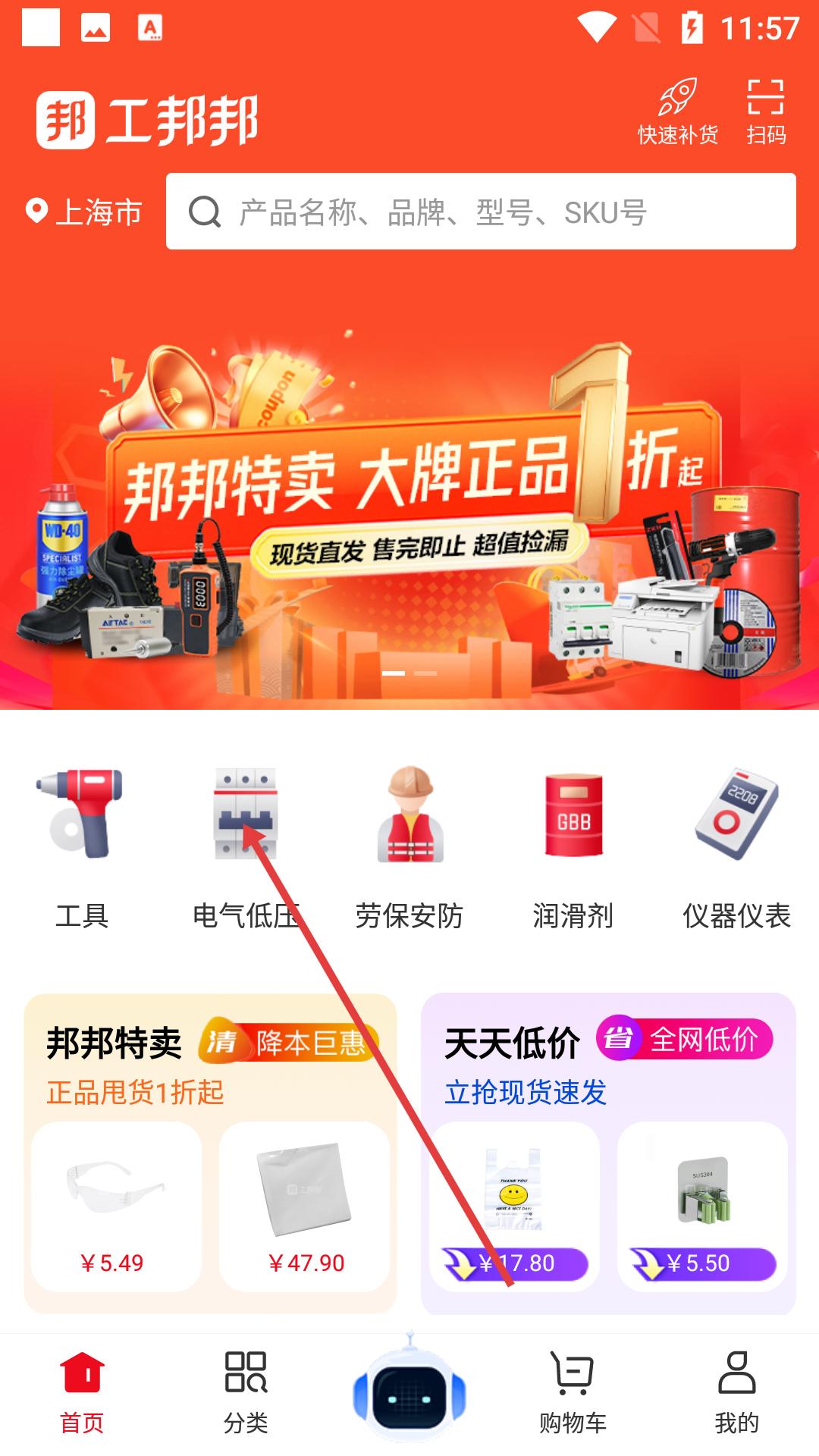 1、進入工邦邦首頁,可看到工具電氣低壓等品類入口及促銷活動,點擊底部我的按鈕,進入個人中心頁面,準備進行賬號相關操作。