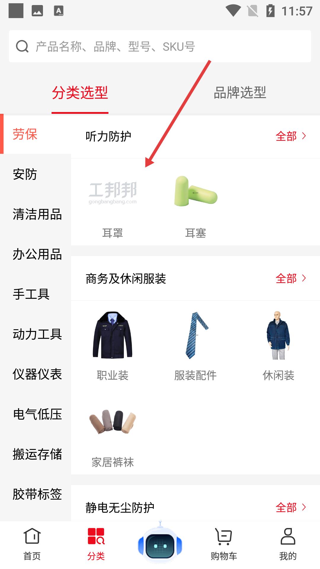 1、APP首頁點擊電氣低壓分類,進入分類選型頁,可瀏覽聽力防護、服裝等工業品分類及商品。
