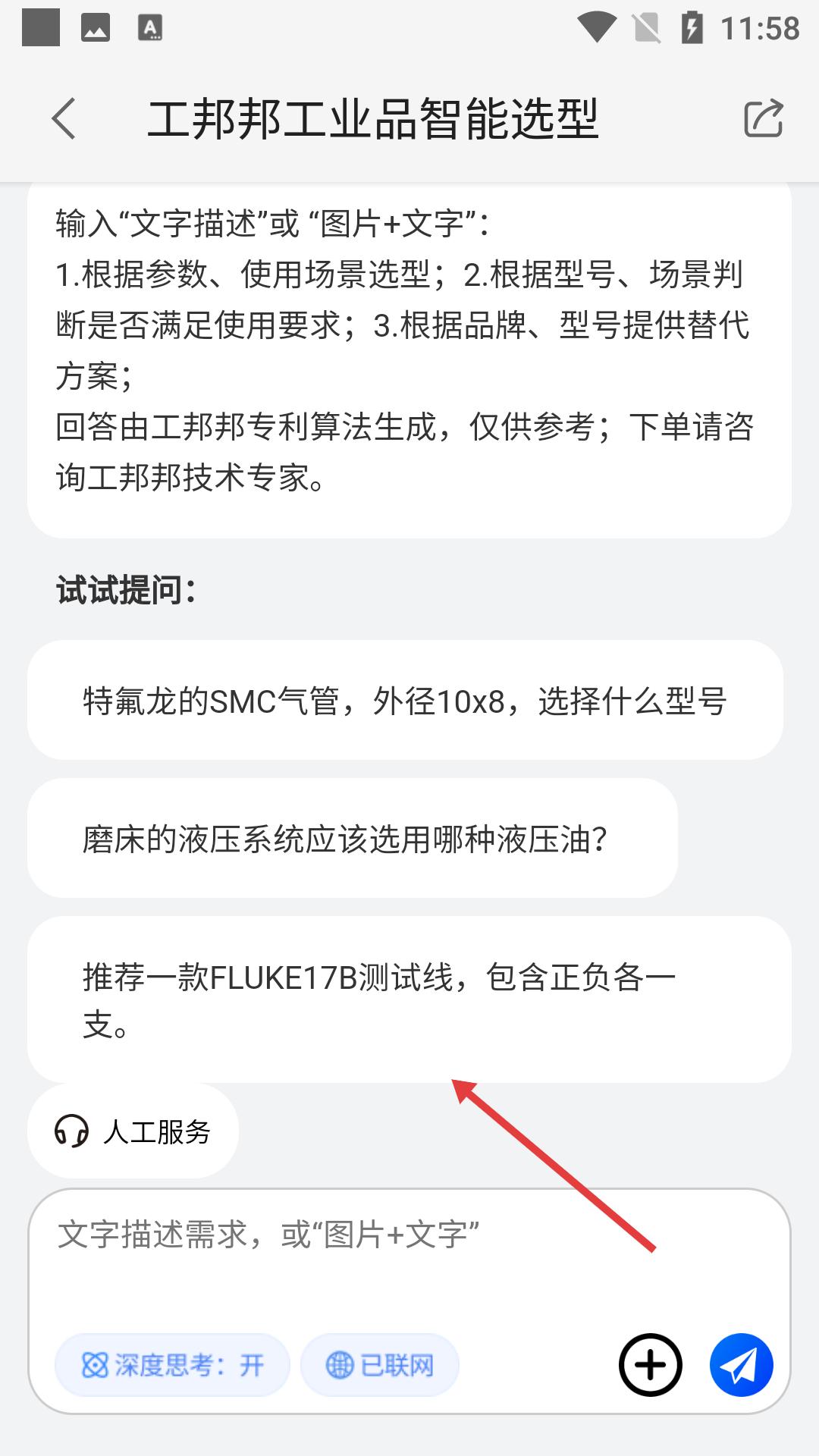 3、進入工邦邦工業品智能選型頁,可輸入文字或圖片描述需求,也可選擇示例問題,獲取工業品選型方案。