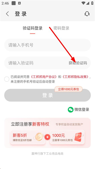 3、選擇驗證碼登錄方式,填寫手機號碼后點擊獲取驗證碼,輸入收到的驗證碼,勾選協議后點擊登錄,完成驗證碼方式的登錄流程。