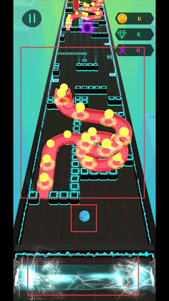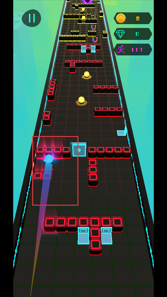 2、在游戲場景中操控角色在路徑上移動,躲避紅色方塊等障礙物,同時收集金幣、鉆石等道具,注意路徑的變化和障礙物的分布。