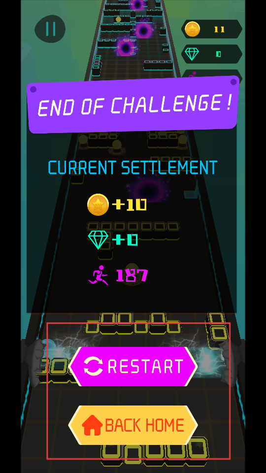 4、挑戰結束后,會顯示獲得的金幣、鉆石數量和移動距離,此時可選擇RESTART重新挑戰,或點擊BACK HOME返回主界面。