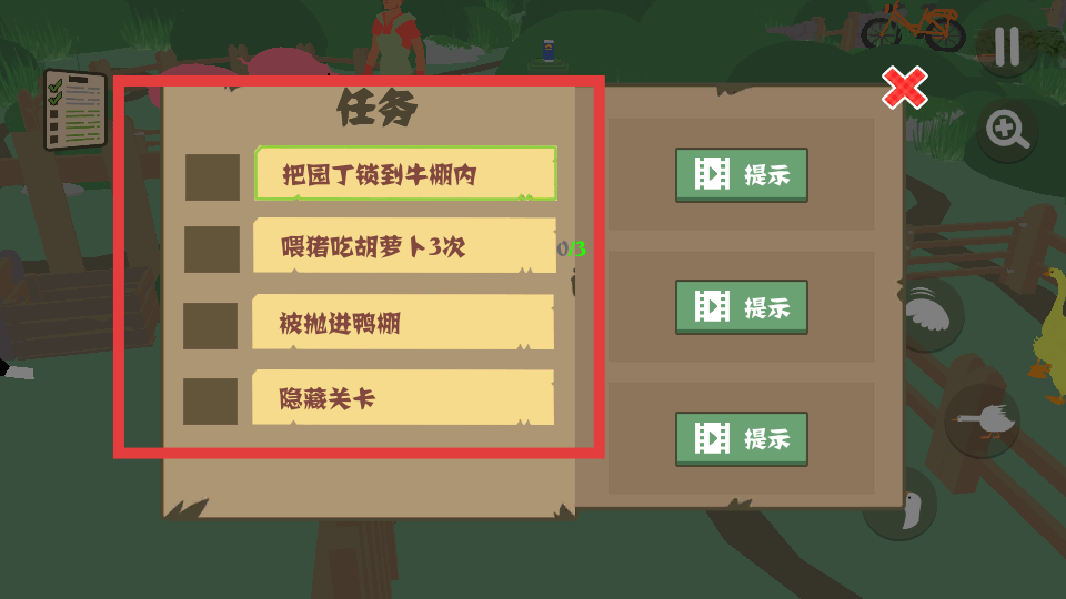 3、進入關卡后,會有把園丁鎖到牛棚內、喂豬吃胡蘿卜3次等任務,按照任務要求去做,完成任務能獲得游戲進展。