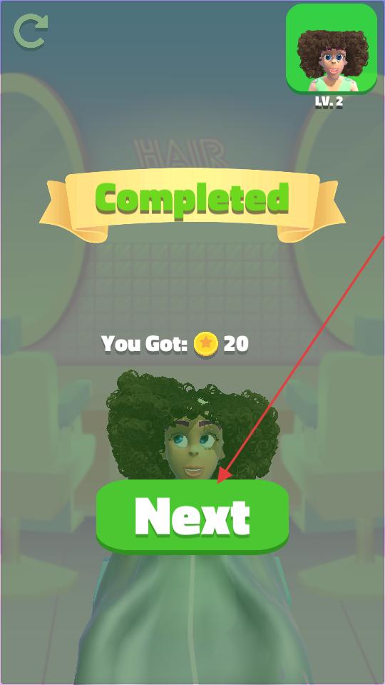 4、完成頭發的修剪和打理后,界面顯示Completed,此時點擊Next按鈕,進入下一個美發美容關卡,繼續為不同的頭發進行打理操作。