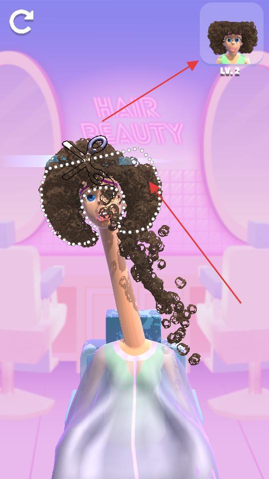 1、基礎操作教學:通過滑動屏幕控制客人頭部移動方向,將需要修剪的部位準確對準下落的美發工具,完成指定形狀的剪裁動作。