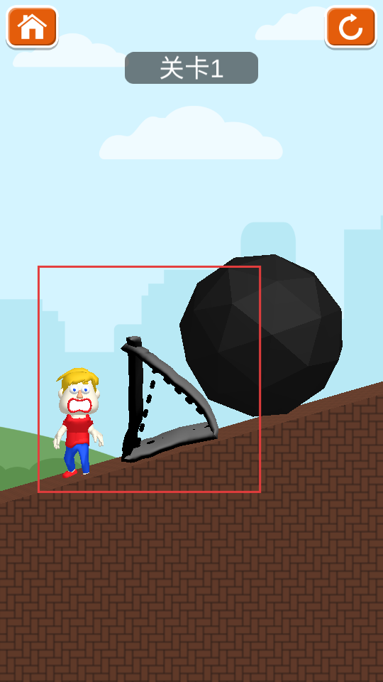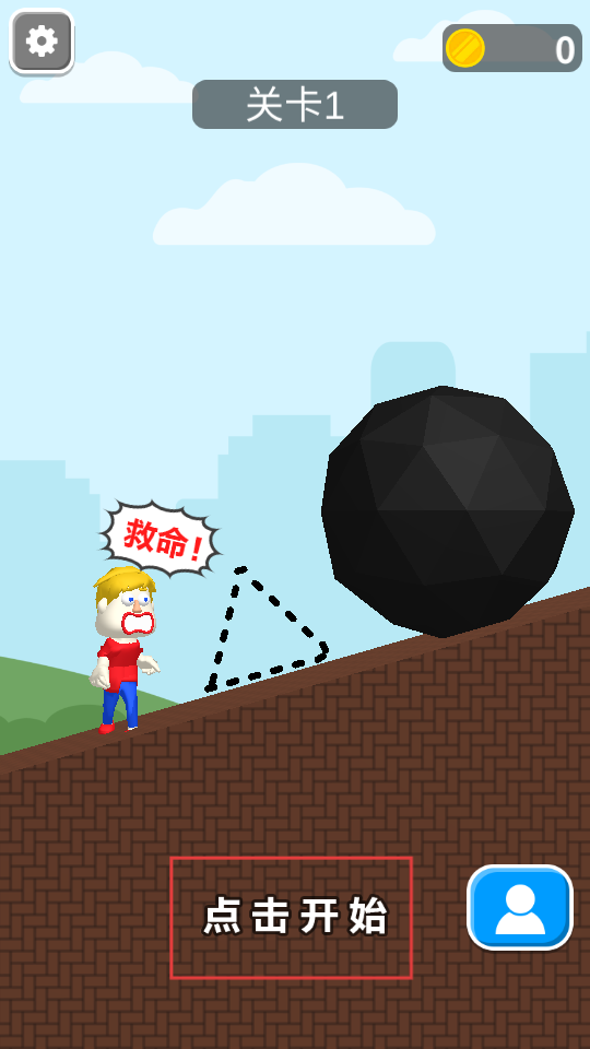 1、進入關卡1,看到人物面臨黑色大石威脅,點擊開始按鈕,開啟保護人物的挑戰,要想辦法阻止大石傷害人物。