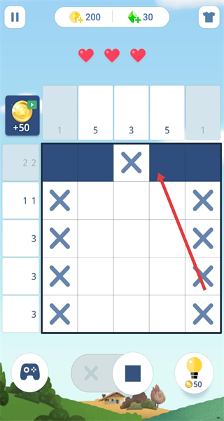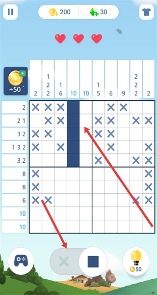 2、觀察網格旁數字,點擊下方方塊工具按數字對應行列填充格子,通過X標記區域還原圖案輪廓。