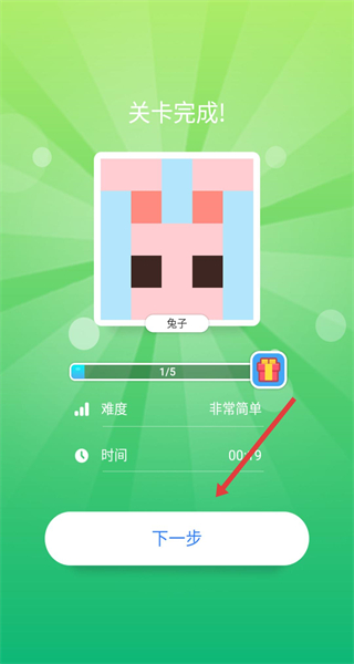 3、關卡完成后點擊下一步結算,獲取獎勵并提升進度,解鎖難度更高的填色謎題持續挑戰。