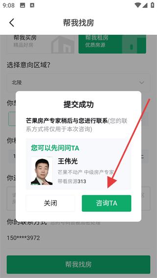 3、提交需求,頁面顯示提交成功,可咨詢房產專家王偉光,了解其帶看房源數量,點擊咨詢TA,獲取專業租房建議。