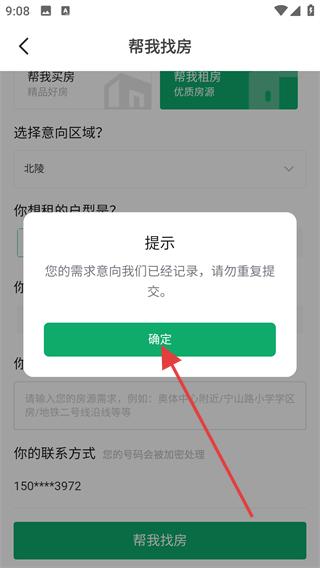 4、若重復提交點擊確定,同時可等待房產專家聯系,全面完成租房需求的提交與咨詢。