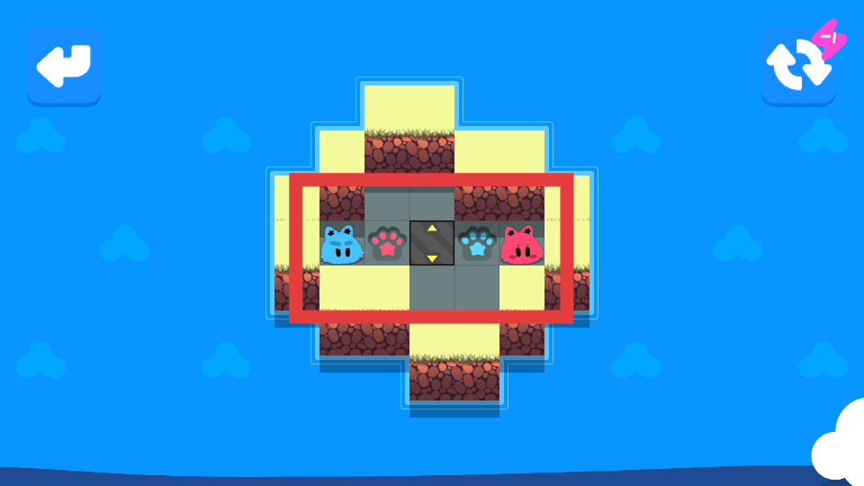 3、進入關卡后,操控藍色和粉色的角色,移動到帶有對應爪印的位置,通過互動來推動游戲中的機關,解開謎題。