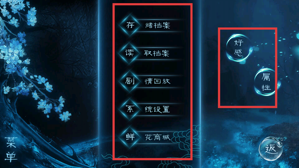 4、菜單界面有存儲檔案、讀取檔案等功能,可隨時存儲游戲進度方便后續繼續,劇情回放能重溫精彩片段,還可查看好感、屬性,去鮮花商城獲取道具。