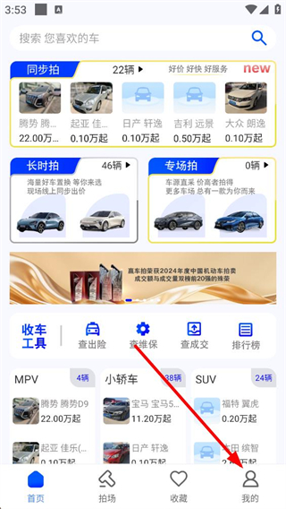 1、進入贏車應用首頁,可查看同步拍長時拍等板塊的車輛信息,還有收車工具等功能入口,點擊底部我的按鈕,進入賬號相關操作界面。