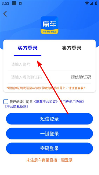 2、賬號操作界面進入登錄頁面,默認顯示買方登錄選項,可看到賬號短信驗證碼輸入欄位,準備填寫信息完成買方賬號登錄。