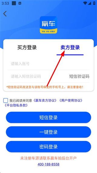 3、登錄頁面切換至賣方登錄選項,查看對應的賣方協議內容,同樣可通過短信一鍵或密碼方式,完成賣方賬號的登錄操作。