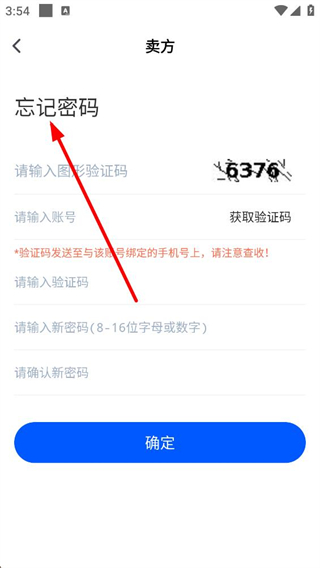 4、若賣方登錄時忘記密碼,可進入忘記密碼頁面,依次填寫圖形驗證碼賬號短信驗證碼,再設置新密碼,點擊確定完成重置。