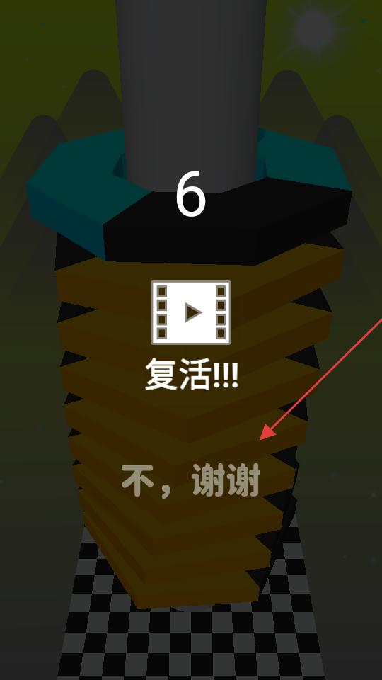 4、若小球闖關失敗界面會出現復活提示,可選擇是否復活,若選擇不復活,點擊不,謝謝,重新開始關卡挑戰,再次操控小球下落闖關。