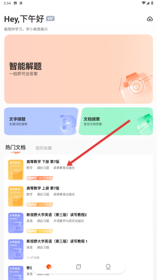1、進入學習工具界面,能看到智能解題、文字搜題、文檔搜索等功能,還有熱門文檔推薦,可選擇高等數學下冊第7版等文檔。
