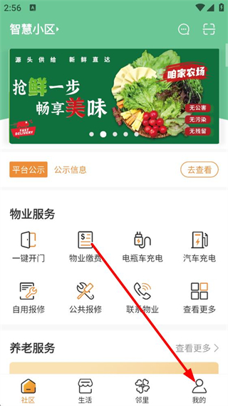 1、社區頁面可使用一鍵開門物業繳費等物業服務功能,了解平臺公示信息,點擊底部我的按鈕,可進入個人中心頁面。