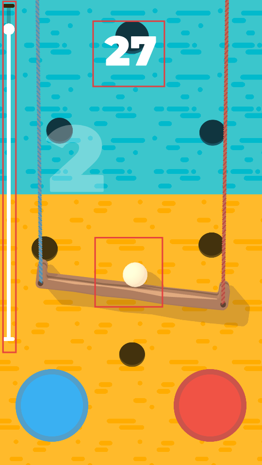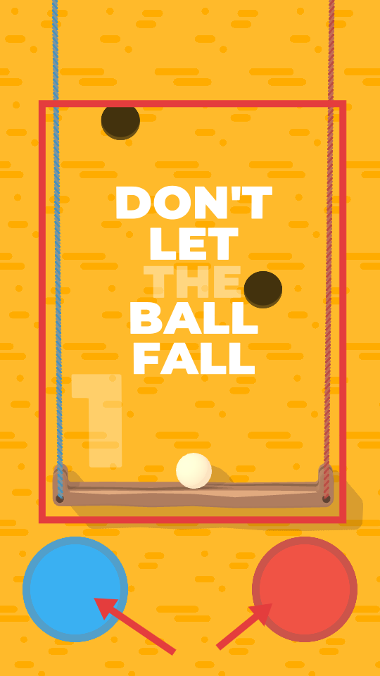 1、游戲開始,界面提示DONT LET THE BALL FALL,操控下方藍、紅按鈕,保持木板平衡,防止小球掉落,開啟第一關挑戰。