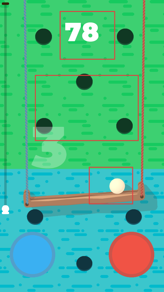 3、到第三關,場景和障礙物分布變化,依舊操控按鈕平衡木板,避開更多黑色障礙物,努力讓小球不墜落,提升游戲進度。