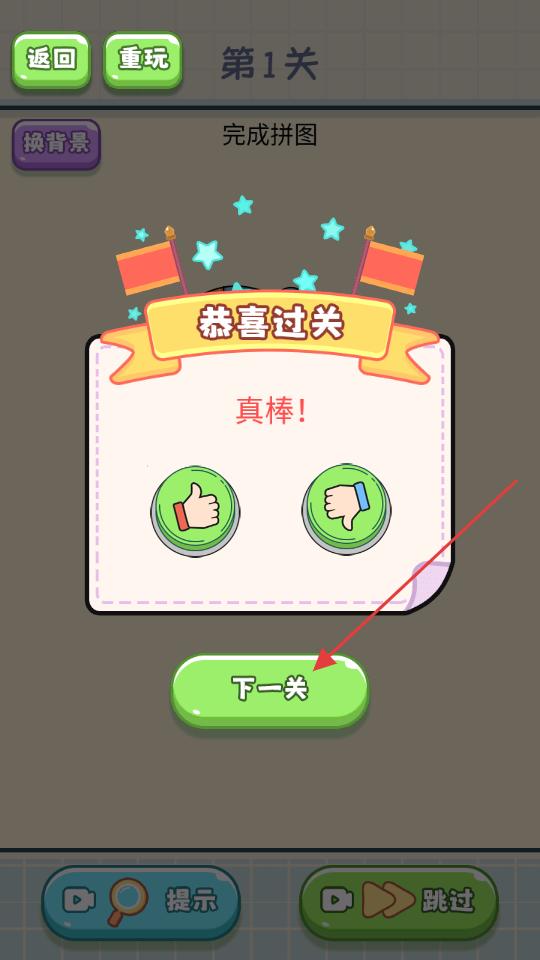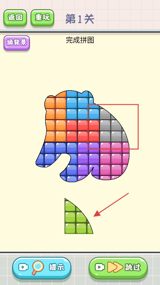4、將最后一塊綠色方塊拖動到拼圖的空白處,完成整個動物形狀的拼圖此時界面顯示恭喜過關,點擊下一關按鈕,進入下一個拼圖關卡。