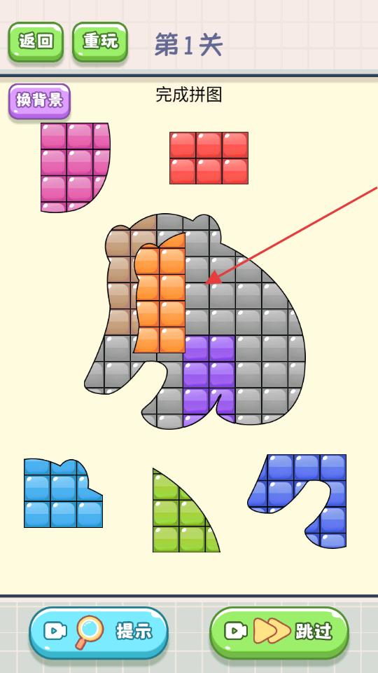 3、繼續挑選藍色、紅色等方塊,精準拖動到剩余的空白區域,讓動物形狀的拼圖逐漸完整,只剩最后部分空白等待填充。
