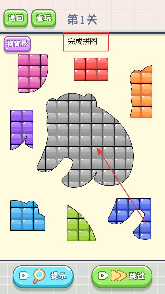 1、進入游戲第1關看到需要完成的動物形狀拼圖輪廓,周圍分布著不同顏色和形狀的方塊,開始挑選合適的方塊,準備進行拼圖。