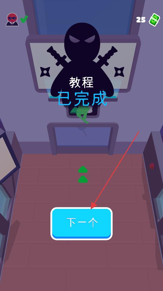 4、擊敗所有敵人完成當前場景的戰斗任務后,會顯示教程已完成,此時點擊下一個按鈕,進入下一個游戲場景,繼續潛行戰斗。