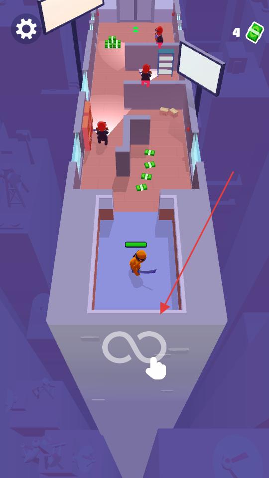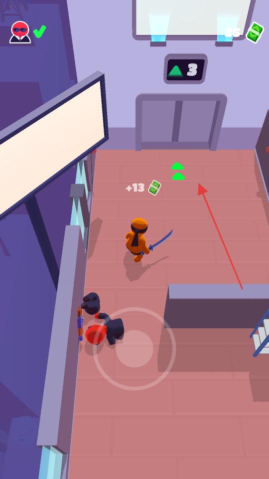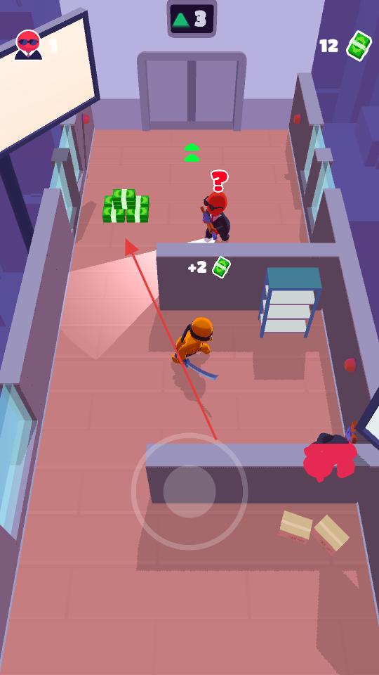 2、靠近敵人后利用手中的武器,對敵人發起突襲,擊敗敵人同時收集場景中的綠色鈔票,積累游戲資源,提升角色實力。