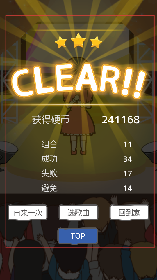 4、關卡完成后,界面顯示CLEAR及獲得的硬幣等數據,可選擇再來一次、選歌曲或回到家,也能點擊TOP返回頂部。
