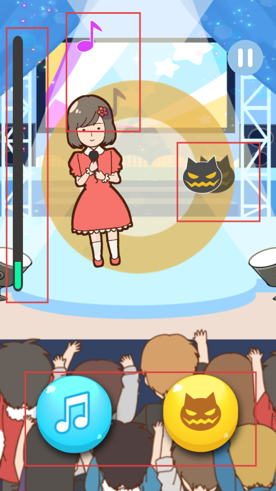 3、進入舞臺場景,根據音符和黑色貓形圖標,點擊下方對應的藍色音符按鈕或黃顏色的貓形按鈕,完成節奏操作。