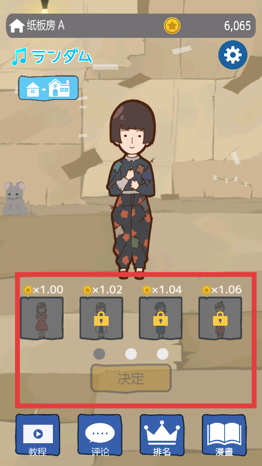 2、在紙板房A場景,選擇不同的角色形象,不同形象有不同的金幣倍數,選好后點擊決定,開啟相關玩法。