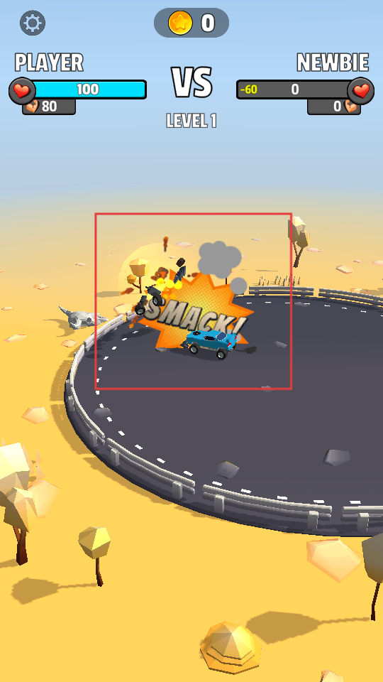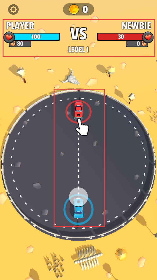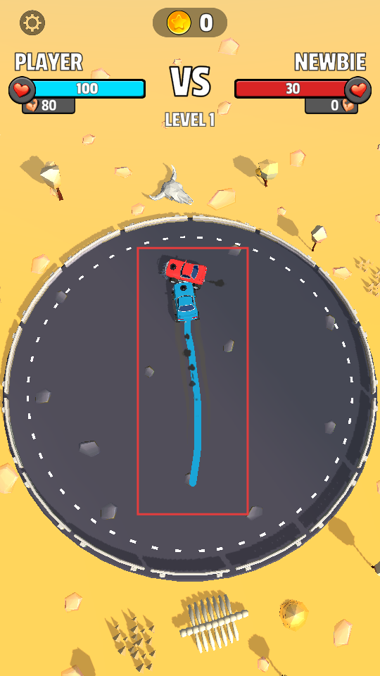 2、藍車依著畫好的線條出發,駕駛藍色汽車向紅色汽車沖撞,碰撞時會留下藍色軌跡,通過不斷撞擊,消耗紅色汽車的血量,逐步占據上風。