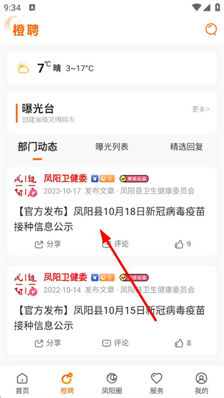 2、進入橙聘界面,可見曝光臺板塊及部門動態標簽,能查看鳳陽衛健委發布的疫苗接種信息等官方資訊文章。
