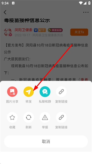 4、文章詳情頁點擊分享,會彈出包含轉發等選項的菜單,可選擇對應方式分享該資訊文章的內容。