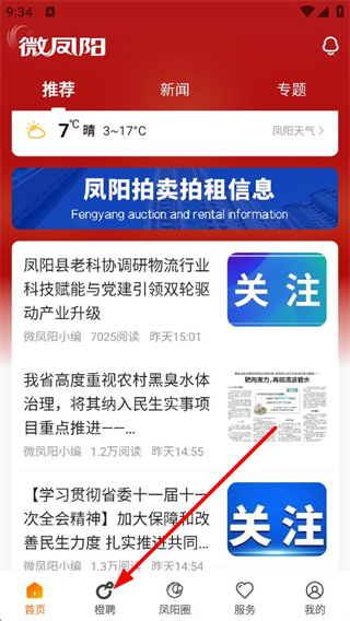 1、進入微鳳陽首頁,能看到推薦新聞專題等標簽,顯示當地天氣及各類資訊文章,點擊底部橙聘按鈕可進入對應功能界面。