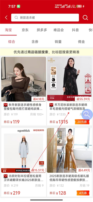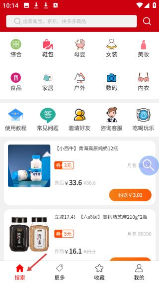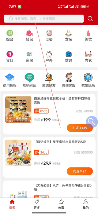 1、進入軟件首頁,可通過搜索框查找商品,也能點擊綜合鞋包等分類入口瀏覽,查看展示的商品列表及對應的券后價格,選擇感興趣的商品。