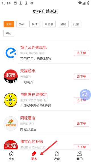 2、點擊更多界面呈現多樣商城返利項目,包含外賣、電影票、酒店等,如餓了么、天貓超市,助力省錢。
